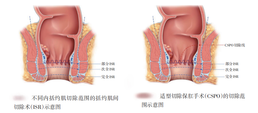 ISR 手术是一种极限保肛手术。手术需要在内外括约肌之间进行分离,将直肠肿瘤完整切除,然后将剩余的直肠与结肠进行吻合。为更精准地切除肿瘤并保留更多括约肌功能,也可行对经典ISR手术改良的适形切除保肛手术。这类手术在保证肿瘤根治性的同时,尽可能保留肛门功能。